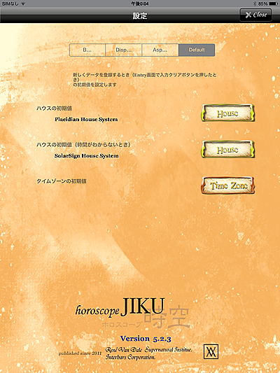 日付、時間、場所(MAP機能で世界中に対応)、タイムゾーン、夏時間(サマータイム) 、ハウスを(プラシーダスハウス(The Placidian House),コッホハウス(The Koch House),キャンパナスハウス(The Campanus House),レジオモンタナスハウス(The Regiomontanus House),トポセントリックハウス(The Topocentric House),アルカビタスハウス(The Alcabitius House),クルシンスキー/ピサハウス(The Krusinski-Pisa House),ポルフュリオス(The Porphyry House)
