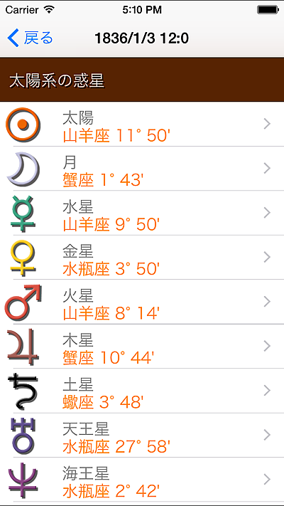 (太陽、月、水星、金星、火星、木星、土星、天王星、海王星、冥王星)